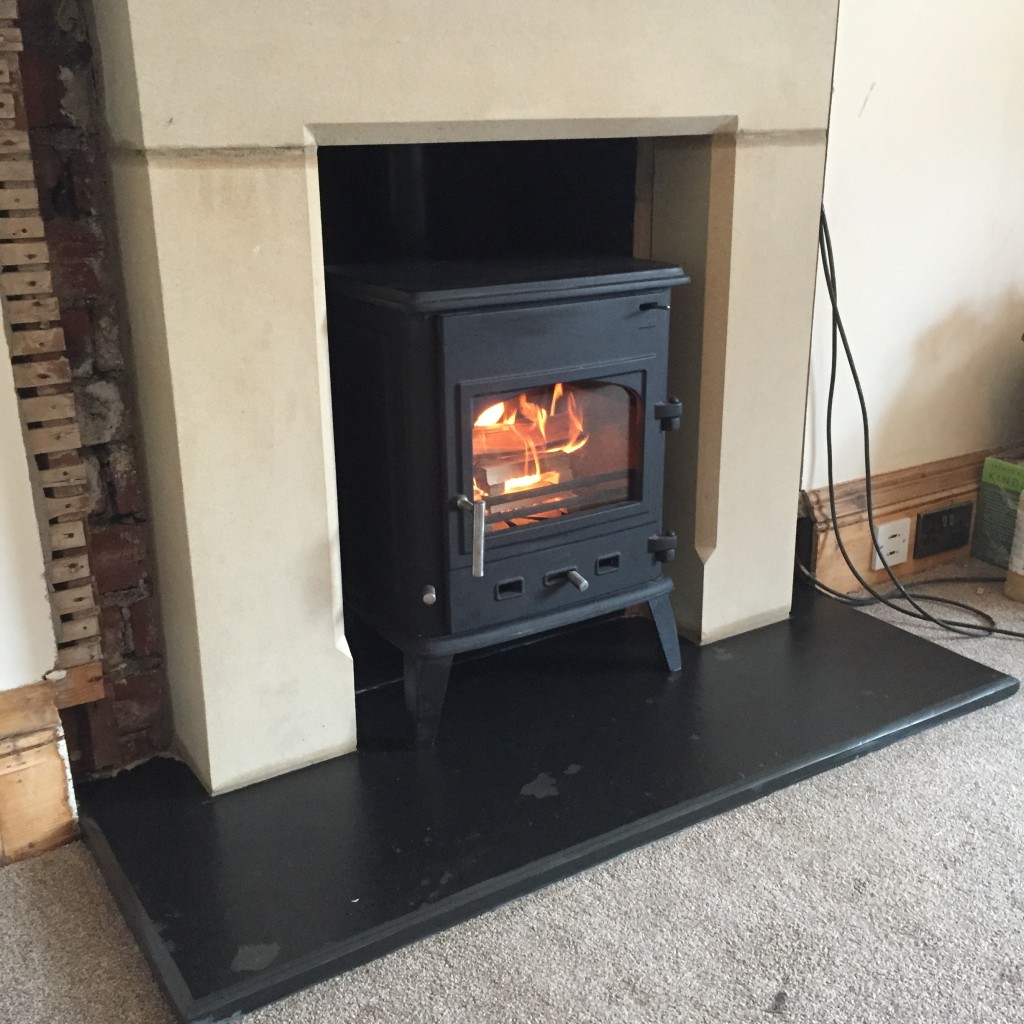 Another busy week. Old painted stone detail cleaned up and brought back to life. New Sandstone indian paving made into copes. A new fire surround and a new stove fitted. Keeping our office and showroom warm this week! Our bio ethanol Fire has its surround finished. Pop in and feel the warmth!